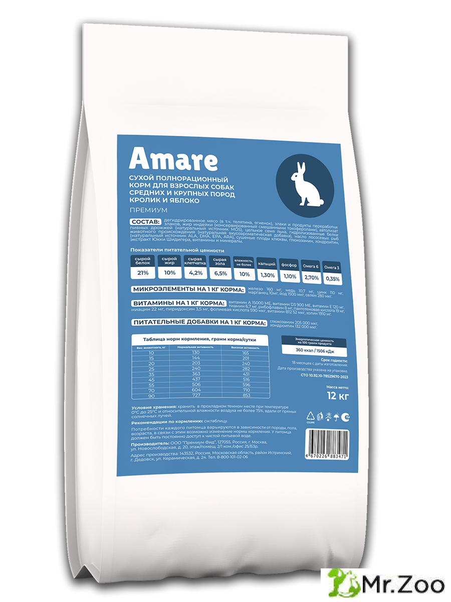 Amare Сухой полнорационный корм для взрослых собак средних крупных пород, кролик и яблоко 10 кг. Состав: дегидрированное мясо (в т.ч. телятина, кролик), злаки и продукты переработки злаков, жир индейки (консервированный смешанными токоферолами), автолизат пивных дрожжей (натуральный источник МОS), цельное семя льна, гидролизованные белки животного происхождения (натуральная вкусоароматическая добавка), масло лососевых рыб (натуральный источник ALA, DHA, EPA, ARA), сушеные яблочные плоды, глюкозамин, хондроитин, экстракт юкки шидигера, витамины и минералы. Энергетическая ценность на 100 грамм продукта, ккал/кДж 360/1506