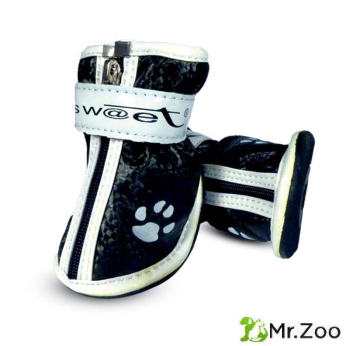 Комплект ботинок для собак с модным принтом и функциональной прорезиненной подошвой - незаменимый аксессуар индивидуальной защиты лап животного от воздействия агрессивных жидкостей, дорожных химреагентов, бензинов и масел на проезжей части дорог. Прочные, комфортные и непромокаемые, они сохраняют лапы собаки чистыми и сухими в ненастную погоду и защищают их от истирания о твердое покрытие при длительных и интенсивных нагрузках. Размер изделия: 50х40х50 мм. Цвет: черный.