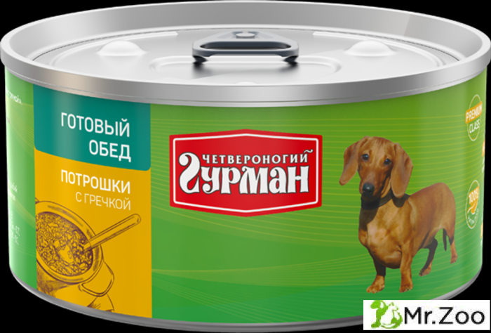 Четвероногий гурман “Готовый обед” для собак – это влажный корм премиум класса. В его составе используются мясные компоненты высшего качества и злаки в оптимальных пропорциях (примерно в пропорции 80/20). Хорошо проваренная гречка или рис с самыми питательными видами мяса дают питомцам сытость и запас энергии. Корм полностью натуральный – в его составе нет искусственных красителей, ароматизаторов, усилителей вкуса и ГМО. Подходит для собак всех пород.