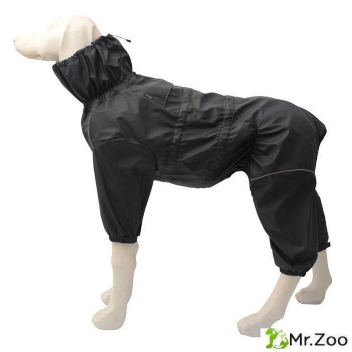 Костюм-дождевик OUTDOOR Cross с высоким воротом - идеальное решение для комфортных прогулок даже в самую ненастную погоду. Особенностью изделия является его водонепроницаемый материал - полиуретановая кожа - это инновационный и высокотехнологичный материал, обладающий отличными характеристиками и имеющий структуру и строение натуральной кожи. Такая одежда защитит шерсть животного от дождя и грязи, а непродуваемая ткань - от сильного ветра и холода. Благодаря высокому воротнику и регулировке по линиям шеи и талии костюм-дождевик садится "по фигуре" питомца и не стесняет его движений во время прогулки. Изделие надежно фиксируется при помощи молнии на боку и двух эластичных пряжек, а на штанинах предусмотрены удобные резинки, препятствующие попаданию грязи или налипанию снега снизу. Ширина штанин регулируется за счет липучек. Светоотражающие полоски обеспечивают безопасность питомца в темное время суток. Костюм без подкладки. Цвет: черный. Длина по спинке: 400мм; обхват груди: 530-650мм;