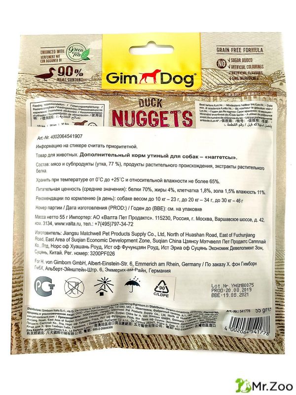 Дополнительный корм GimDog (ДжимДог) Nuggets – наггетсы – кусочки филе в сочетании с ароматным зеленым чаем.